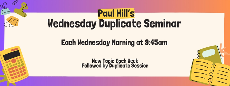 Every Wednesday morning, the Club runs a mini seminar and duplicate session starting at 9:45 am with teacher and ABF-approved director Paul Hill. Each week, Paul will present a new topic during a 15-minute mini seminar, providing key insights and strategies. The duplicate session begins at 10:00 am, with boards designed to coincide with the seminar notes, allowing you to immediately apply what you’ve learned.